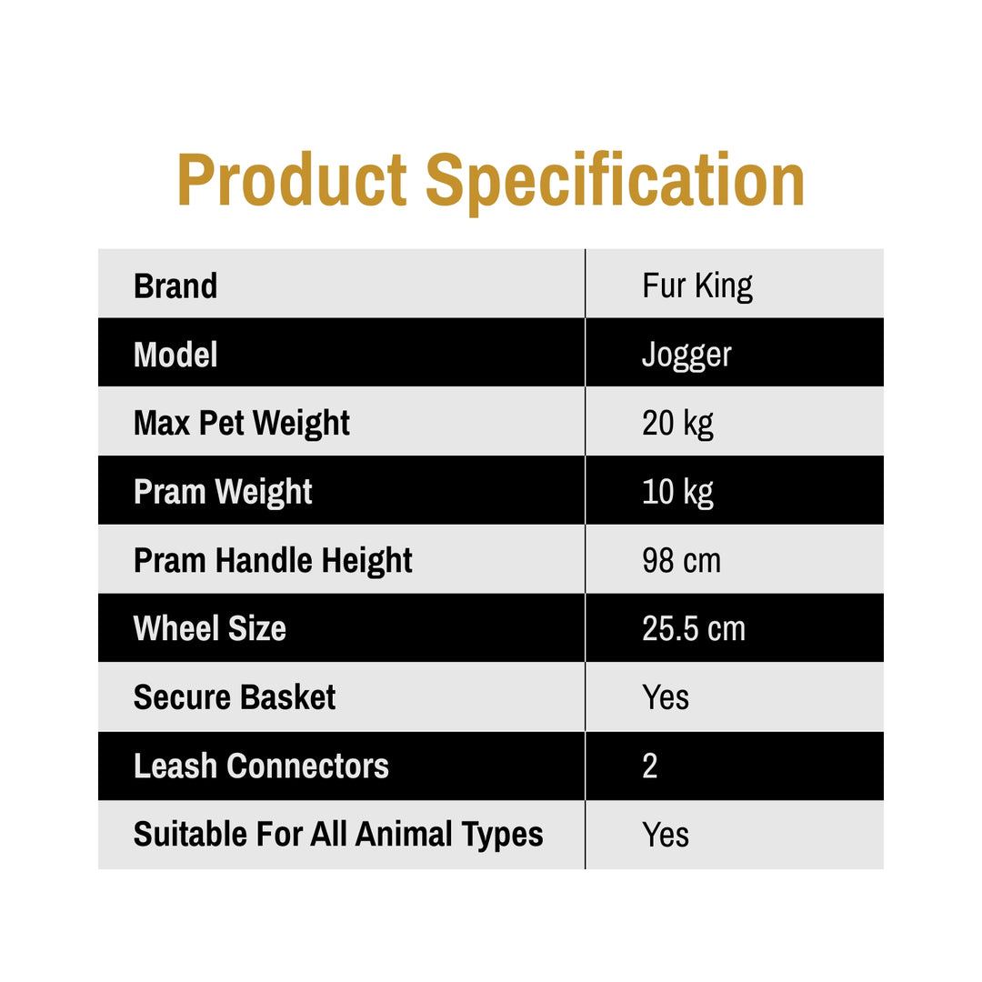 The Fur King Jogger Version 1 is your pet’s first-class ride for outdoor adventures. With large EVA wheels for smooth all-terrain handling, a spacious cabin for pets up to 20 kg, and zipper-free quick access, it’s built for comfort and convenience. Ergonomic handles, dual safety tethers, generous storage, and a simple 6-step fold make every walk effortless.