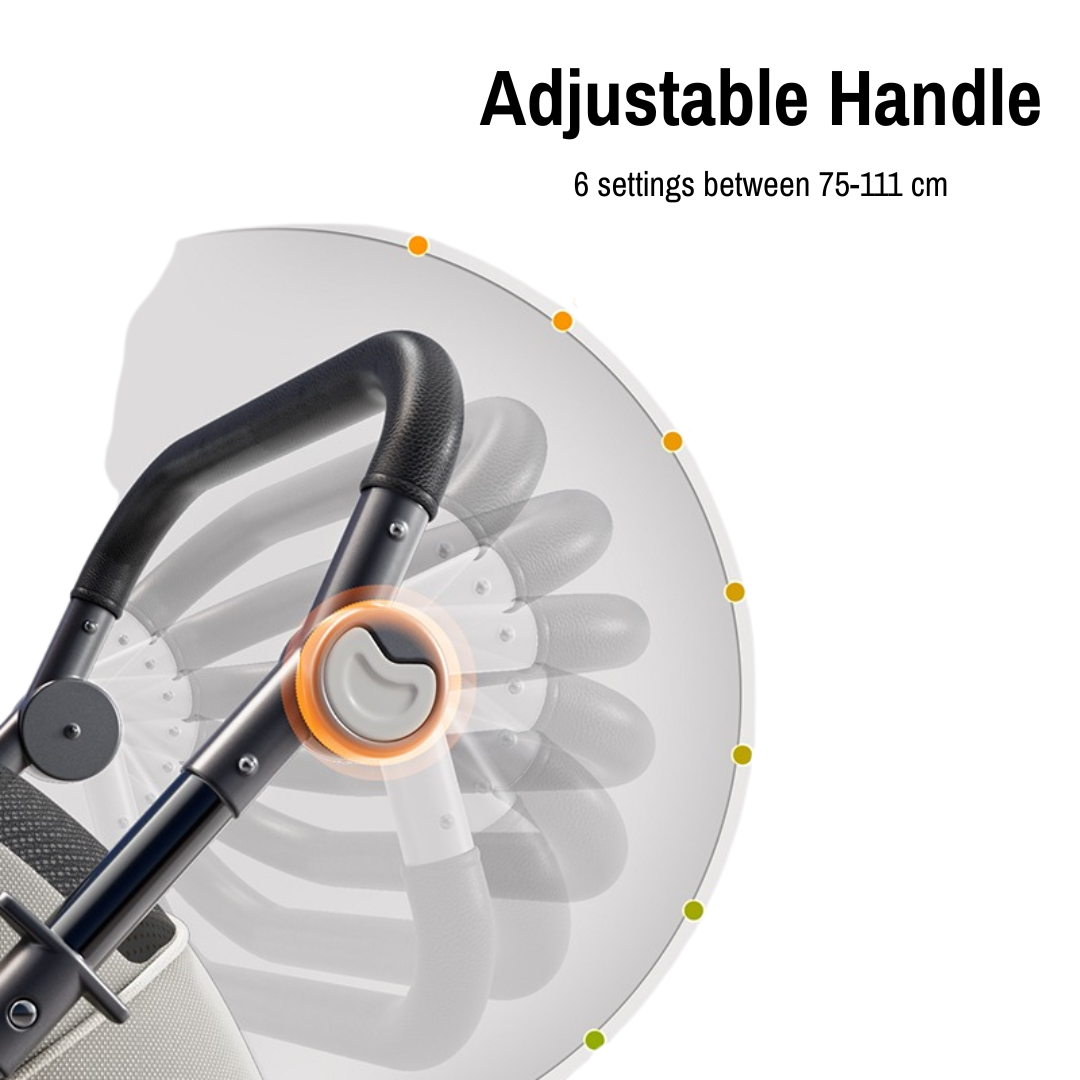 Comfortable control for you - The adjustable height handle lets you stroll in a natural comfortable position. No stretching or hunching just easy pushing. It has 6 settings between 75-111 cm.